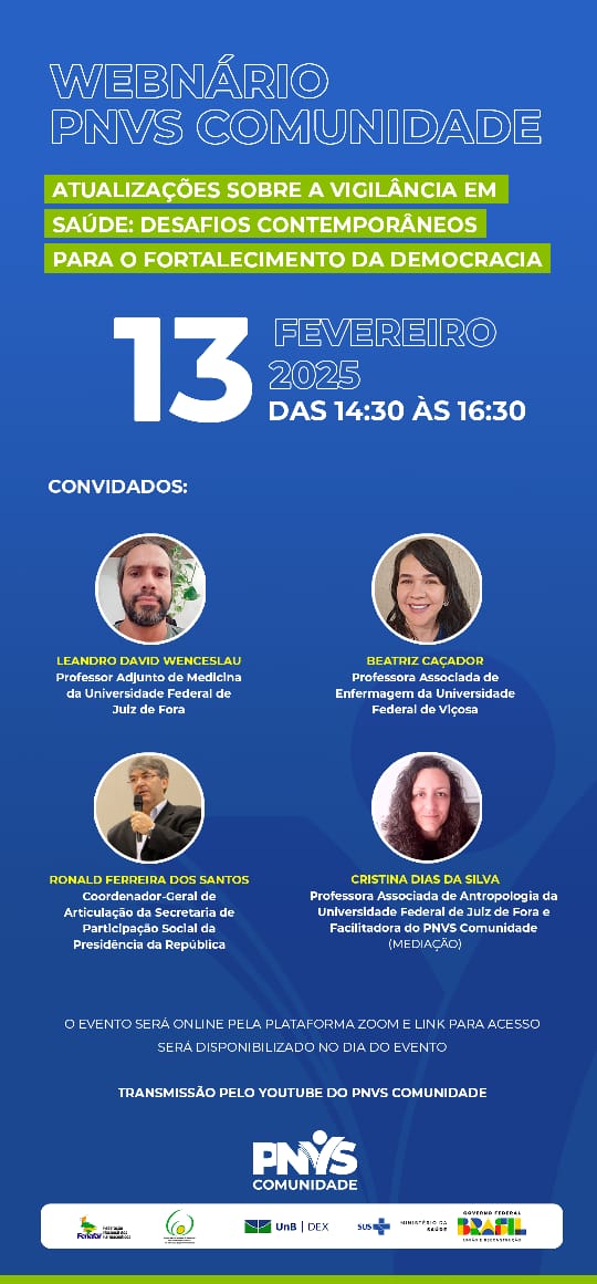 No dia 13/02/2025, das 14h30 às 16h30h, ocorreu o Evento do Programa de Extensão para implementação da Política Nacional de Vigilância em Saúde do SUS e a Participação da Comunidade (PNVS Comunidade). A coordenadora do LAPS, Dra. Cristina Dias da Silva, foi a mediadora do evento.