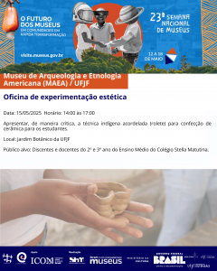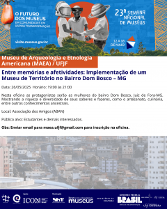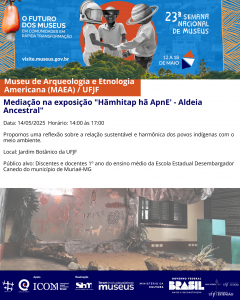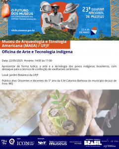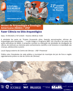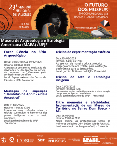 🔸O Museu de Arqueologia e Etnologia Americana (MAEA), setor da Pró-Reitoria de Cultura (Procult) da Universidade Federal de Juiz de Fora (UFJF) organiza, como parte da 23ª Semana Nacional de Museus os eventos descritos a seguir.