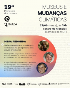 Mesa Redonda: Reflexões sobre as mudanças climáticas na perspectiva dos povos originários. A Mesa Redonda objetiva discutir a questão do clima, a partir dos processos de luta ambiental, das pesquisas acadêmico-científicas e, principalmente, à luz do ponto de vista dos povos originários. Os convidados para comporem a Mesa são: Inaiê Apoenã (indígena pataxó – graduada em Direito), Luciana Bittencourt (professora do Departamento de Turismo-UFJF) e Cézar Barra (professor do Departamento de Engenharia-UFJF). A mesa redonda acontecerá no dia 23 de setembro, das 19h às 21h. A entrada é gratuita e para este evento não há necessidade de realizar agendamento. Local: Centro de Ciências – Campus da Universidade Federal de Juiz de Fora – São Pedro – Juiz de Fora – 36036-900.