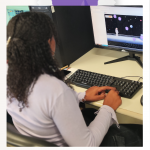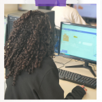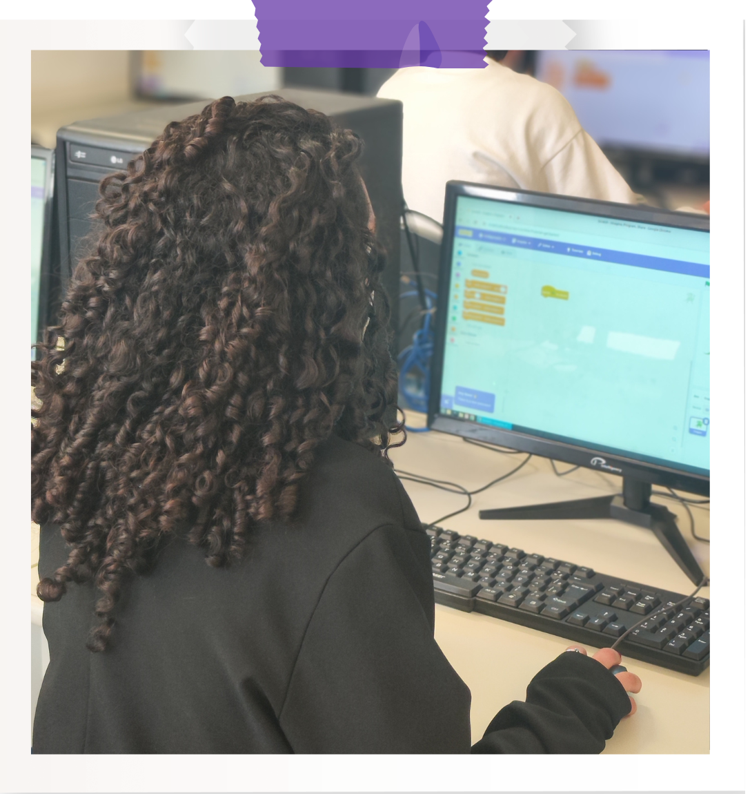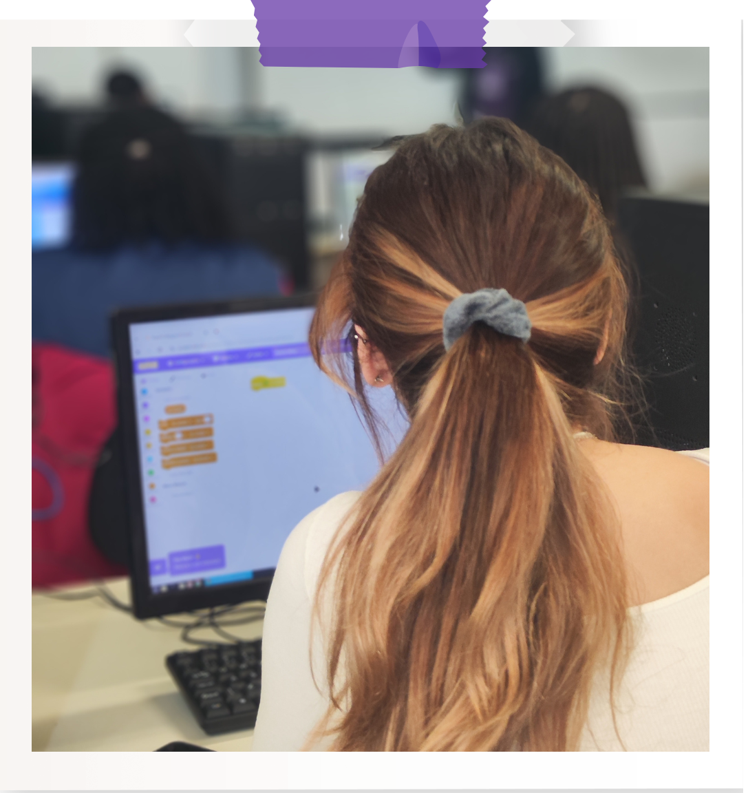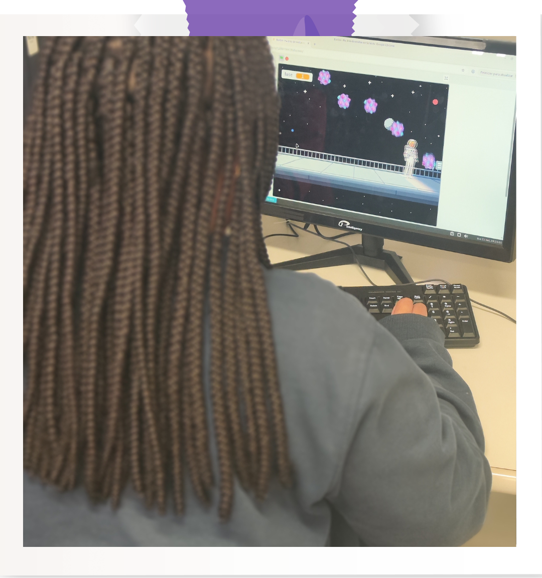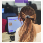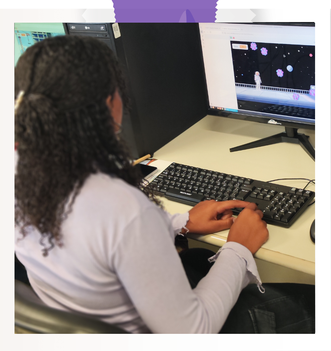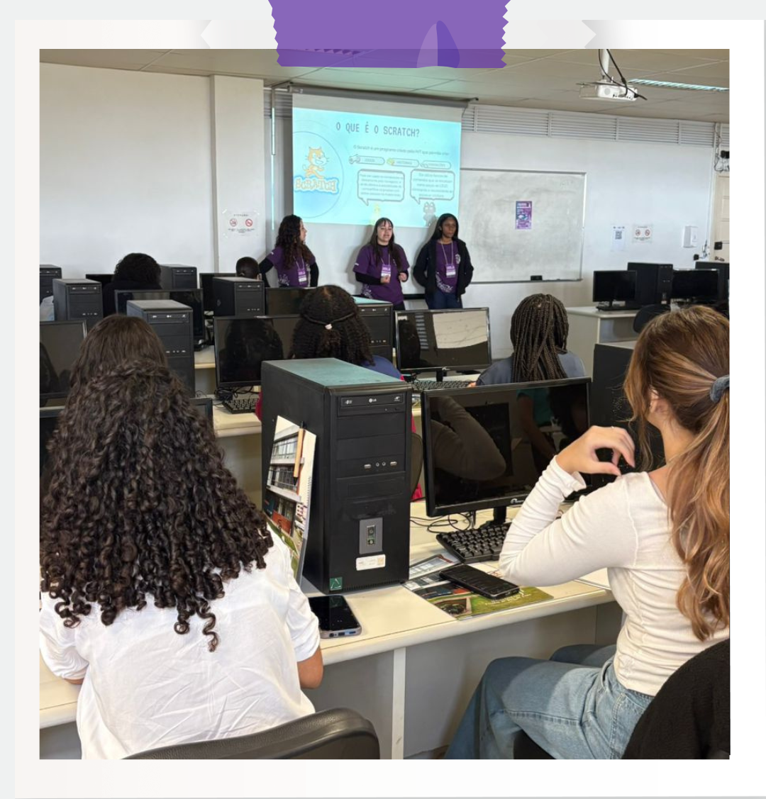 O Encontro teve início com o minicurso Introdução à Programação com Scratch, oferecido pelas bolsistas do projeto, Camila, Maria Eduarda e Maria Clara. À frente da atividade, elas guiaram as participantes nos primeiros conceitos de lógica de programação de maneira leve, dinâmica e participativa.