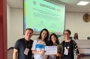 A apresentação do artigo foi realizada pela bolsista de Iniciação Científica Eduarda Miguel, representando a equipe composta pelas estudantes Lara Esteves e Mell Rocha; pela professora da Escola Estadual Delfim Moreira, Suelen Bonoto; e pelas professoras da UFJF Luciana Bruggiolo, Alessandreia Oliveira, Lorenza Moreno e Bárbara Quintela.