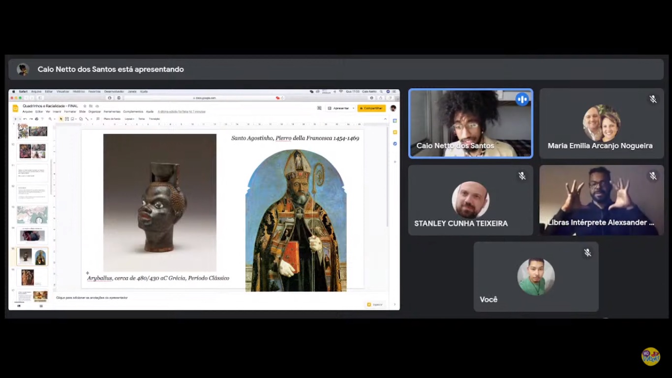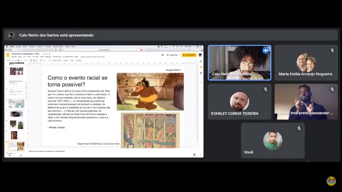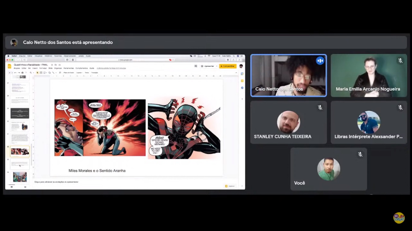 Nessa quarta-feira (28/07), a HQWeek! 2021 recebeu o palestrante Caio Netto, Mestrando em Artes pela Universidade Estadual Paulista Júlio de Mesquita Filho (UNESP). Com o tema inicial “Racialidades nos Quadrinhos”, a explanação acabou ganhando novos contornos a partir de reflexões tecidas pelo artista, que é também coordenador do Núcleo Negro para Pesquisa e Extensão Universitária (NUPE- UNESP) e integrante do Grupo Interdisciplinar de Raça e Política (GIRA).