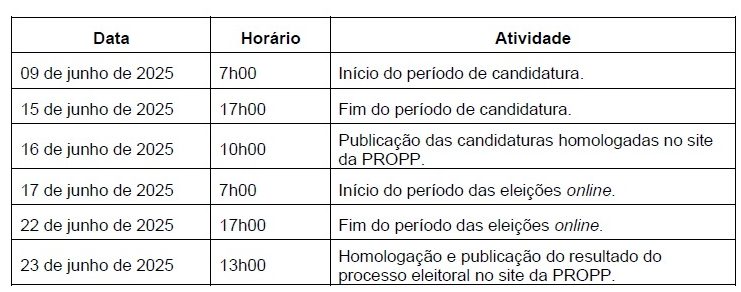 O período de candidatura, segundo o cronograma eleitoral, ocorrerá das 7h00 do dia 09/06/2025 às 17h00 do dia 15/06/2025.