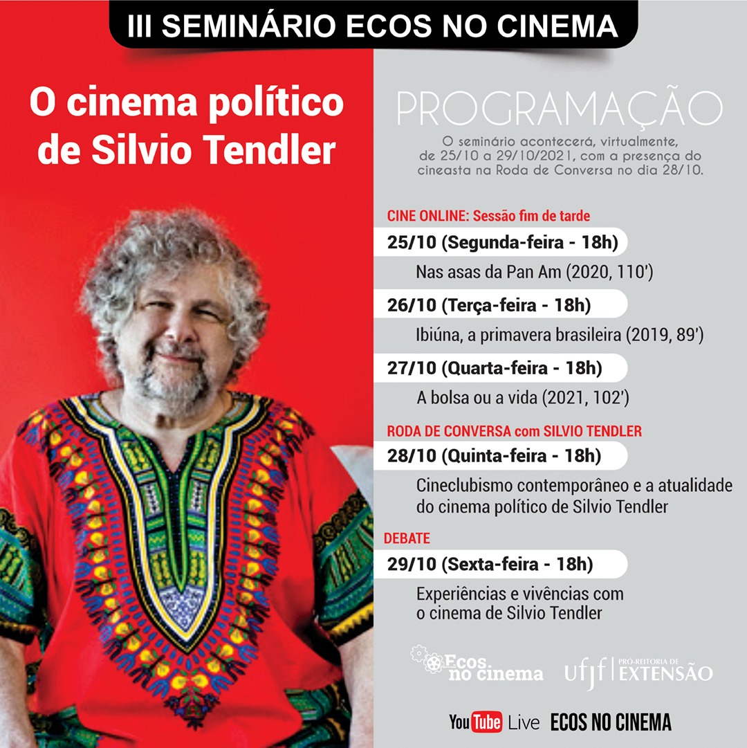 Começa nesta segunda, 25, o 3º Seminário Ecos no Cinema, que reúne rodas de debates e exibição de filmes do diretor Silvio Tendler, além de um bate-papo com o próprio cineasta, referência da cinematografia brasileira. Além de conhecer mais e dialogar sobre as obras de Tendler, será a oportunidade de compartilhar conhecimentos, promovendo a integração cultural pelo viés do cinema. O evento é gratuito, e toda a comunidade pode participar, através do canal do projeto no Youtube. Clique aqui e faça a sua inscrição.