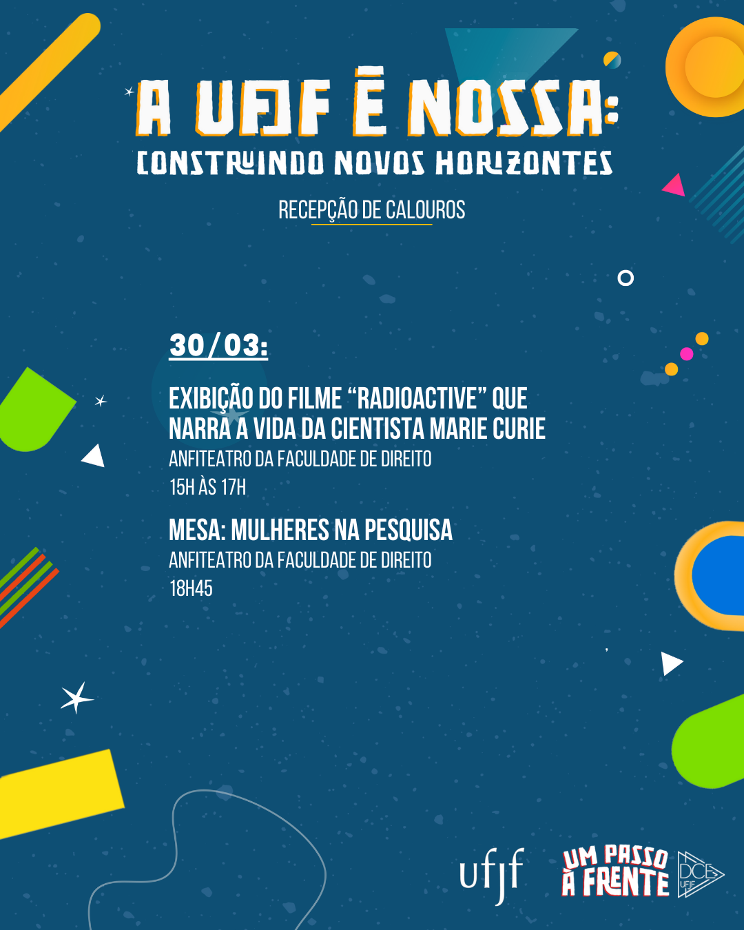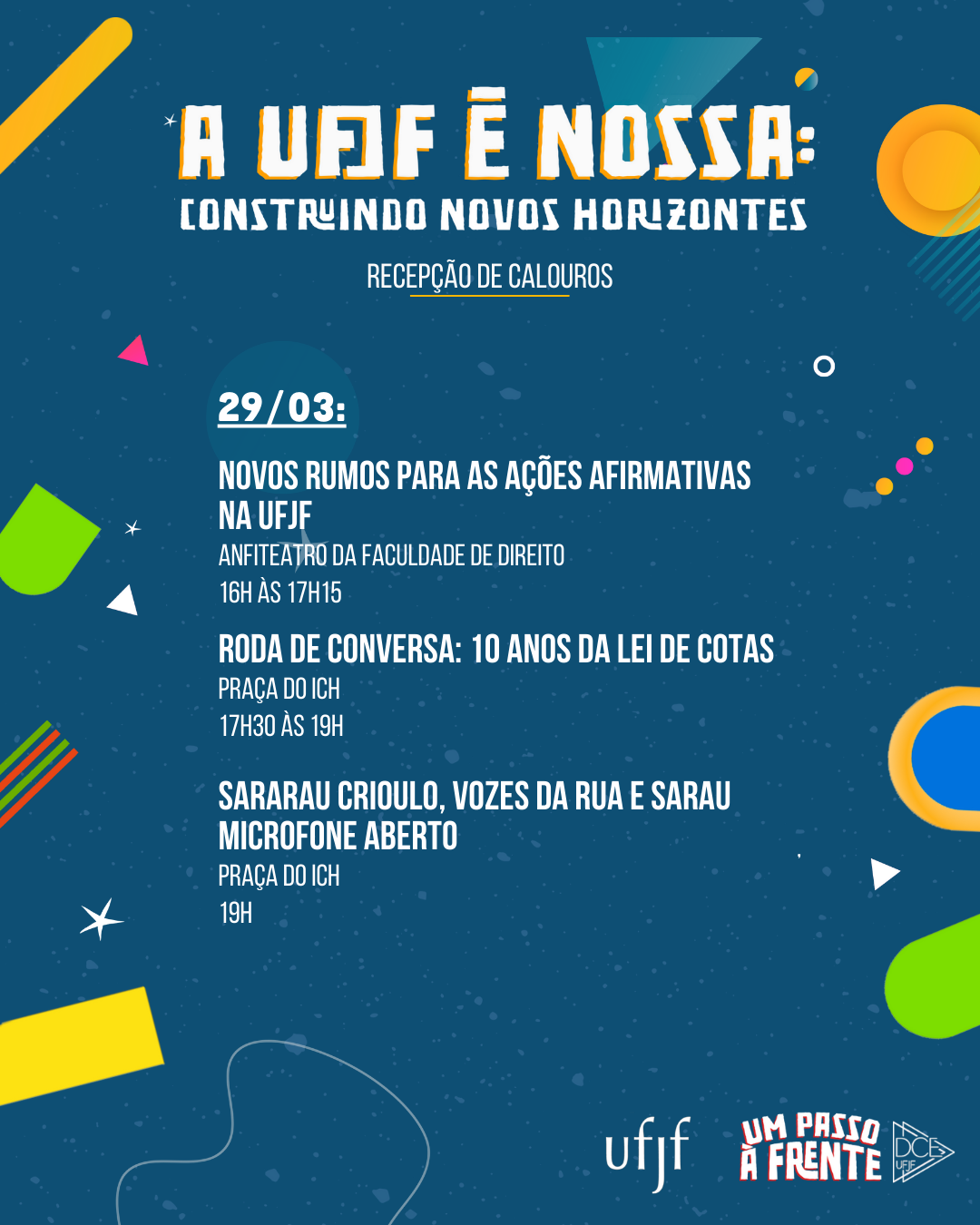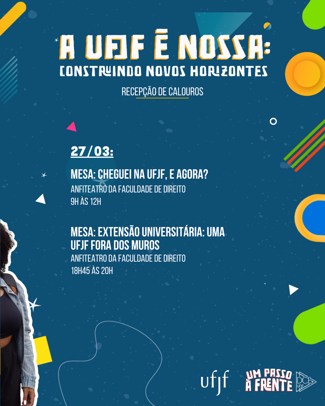 A Recepção de Calouros do Diretório Central das e dos Estudantes (DCE), em conjunto com a Universidade Federal de Juiz de Fora (UFJF), começa na próxima segunda-feira, 27, às 9h, no Anfiteatro de Estudos Sociais, ao lado da cantina da Faculdade de Direito. Com o tema “A UFJF é nossa: construindo novos horizontes”, a programação traz informações úteis para a vida universitária, debates sobre questões sociais e políticas. O reitor da UFJF, Marcus Vinicius David, participa da abertura e dará as boas-vindas aos calouros.