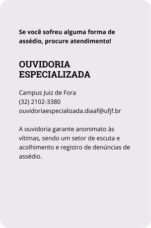 Assédio. Infelizmente, a comunidade acadêmica da Universidade Federal de Juiz de Fora (UFJF) também passa por esse problema. Problema que permeia toda sociedade, sem distinção, mas que se manifesta especialmente onde são latentes os conflitos de poder como no espaço acadêmico. Neste 2 de maio, mais uma data marca a necessidade de enfrentamento dessa prática – o Dia Nacional de Combate ao Assédio Moral.