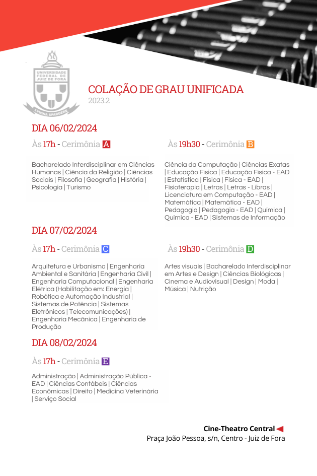 A Universidade Federal de Juiz de Fora (UFJF) definiu as datas para as cerimônias de colação de grau unificada dos formandos do segundo semestre letivo de 2023 e de parte das graduações que seguem cronograma regular em fase de alinhamento com o ano civil. Estima-se que cerca de 1.500 alunos de 53 cursos do campus Juiz de Fora participem da solenidade, agendada para os dias 6, 7 e 8 de fevereiro, em dois horários: 17h e 19h30. O evento ocorrerá no Cine-Theatro Central, e os horários e datas específicos para cada curso podem ser conferidos no quadro ao final desta matéria.