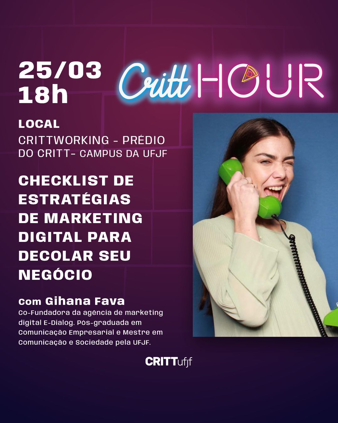 O Centro Regional de Inovação e Transferência de Tecnologia (Critt) da Universidade Federal de Juiz de Fora (UFJF) realiza na próxima segunda-feira, 25, às 18h, o CrittHour. Nesta edição de março, o tema é “Checklist de estratégias de marketing digital para decolar seu negócio”. O evento é aberto ao público e acontece de forma presencial no Crittworking, escritório de uso compartilhado do Centro. Interessados devem se inscrever gratuitamente por meio de link no Sympla.