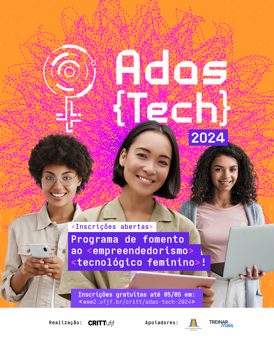 As inscrições para o Adas Tech 2024, programa de Empreendedorismo Tecnológico Feminino do Centro Regional de Inovação e Transferência de Tecnologia (Critt) da Universidade Federal de Juiz de Fora (UFJF), ficam abertas até o dia 5 de maio. A iniciativa é realizada com o objetivo de identificar e apoiar mulheres que tenham ideias ou modelos de negócios com base tecnológica ou que envolvam inovação (inovação de produto, serviço). A participação é gratuita e os interessados devem enviar suas propostas por meio de formulário on-line.