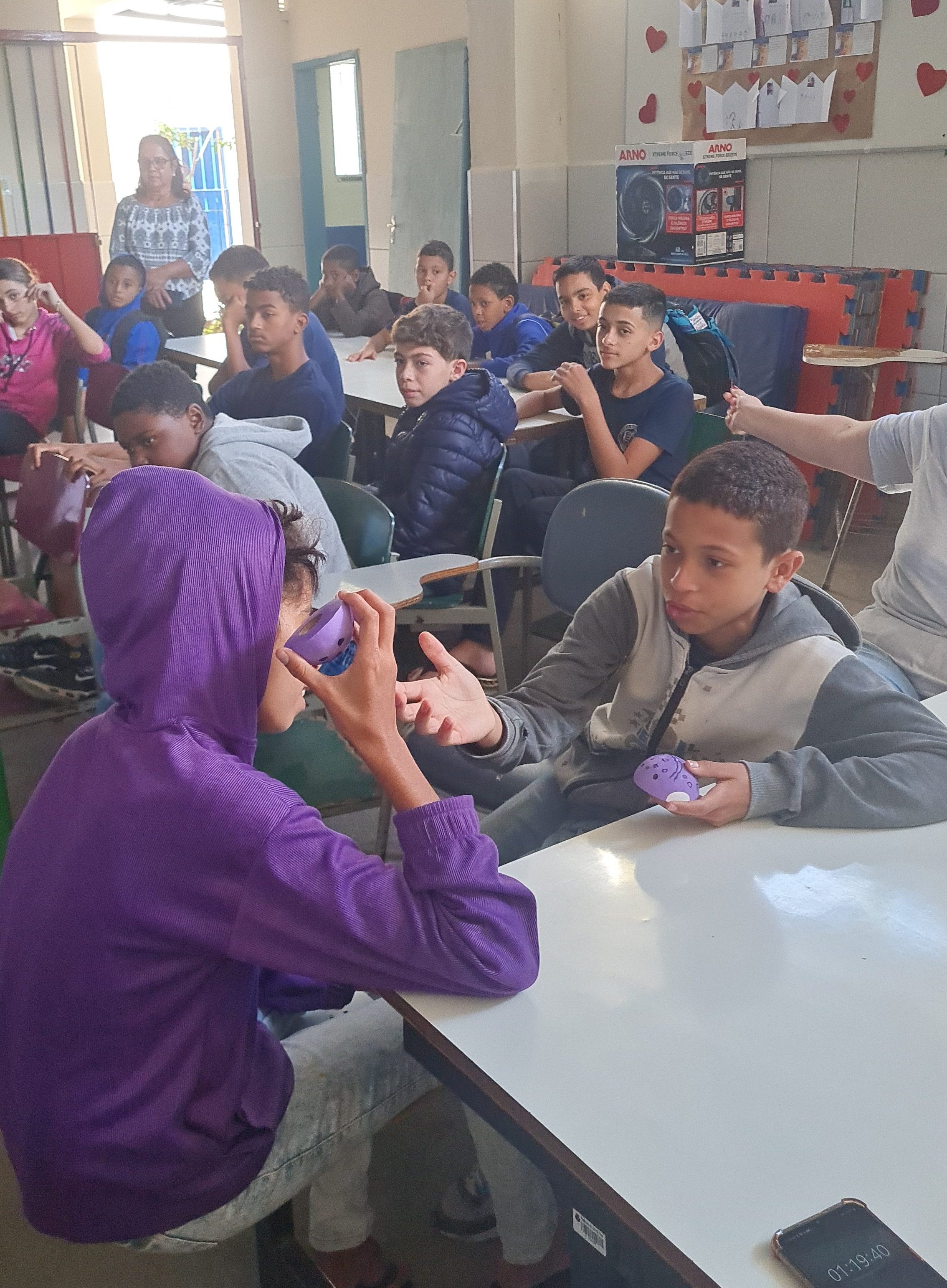 As observações começaram: “A teimosa é mais pesada que a outra!”, “Tem alguma coisa dentro dela”, “Eu sei! É um imã!”. O pesquisador interrompe e começa uma pequena demonstração de como funciona o método científico: “Vamos fazer uma hipótese: o colega de vocês falou que tem um imã dentro da joaninha teimosa. Essa é a nossa hipótese. Como podemos testá-la?”. Prontamente alguns alunos já concluíram: “encosta em um metal!”. Assim foi feito e nenhuma atividade magnética foi detectada.