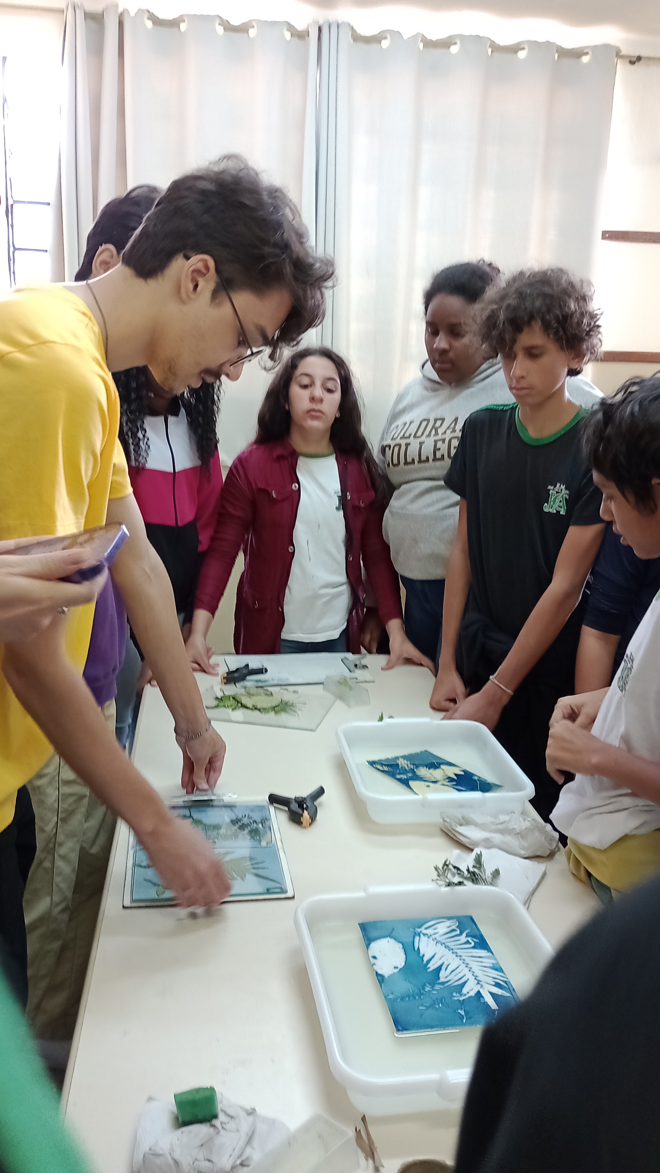 Nesse caso, foram usadas pequenas plantas e folhas para comporem as imagens que seriam criadas a partir das escolhas dos alunos. Após pressionar os papéis e levar ao sol, a reação é instantânea: a folha se torna imediatamente azul e os alunos se reúnem em volta para observar o fenômeno.