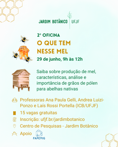 A oficina será ministrada pela coordenadora do Meliponário e professora, Ana Paula Gelli de Faria, e as docentes Andrea Luizi-Ponzo e Laís Rossi Portella – todas do Instituto de Ciências Biológicas (ICB) da UFJF.