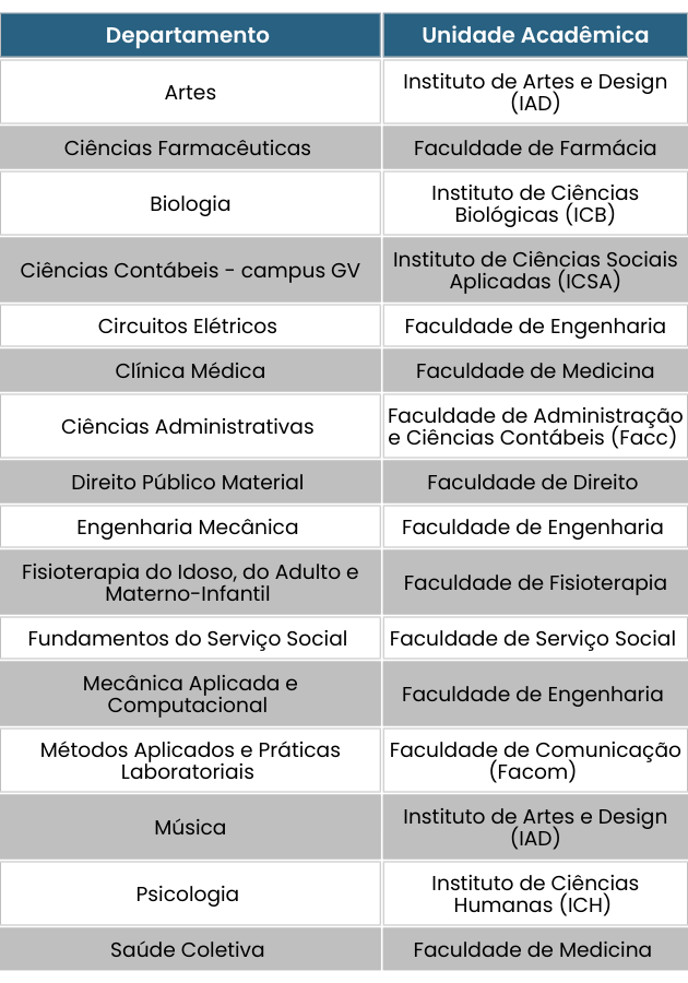 As 16 vagas restantes serão distribuídas entre os seguintes departamentos, de acordo com o gráfico abaixo.