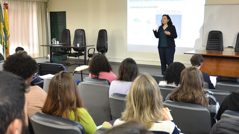 Ela se confunde com uma alergia, mas se diferencia porque todos que comerem determinada quantidade do alimento terão intoxicação. “Essa é uma pista de que o problema está no alimento e não na pessoa”, acrescenta a pesquisadora espanhola. Mariluz veio à UFJF a convite da professora Juliana Carvalho da Costa, que fez estágio de pós-doutorado na Universidade de Barcelona, em 2023, por meio do Programa de Pós-Graduação em Ciências Farmacêuticas da UFJF. A docente brasileira pesquisou a presença de aminas biogênicas em bebidas de base vegetal.