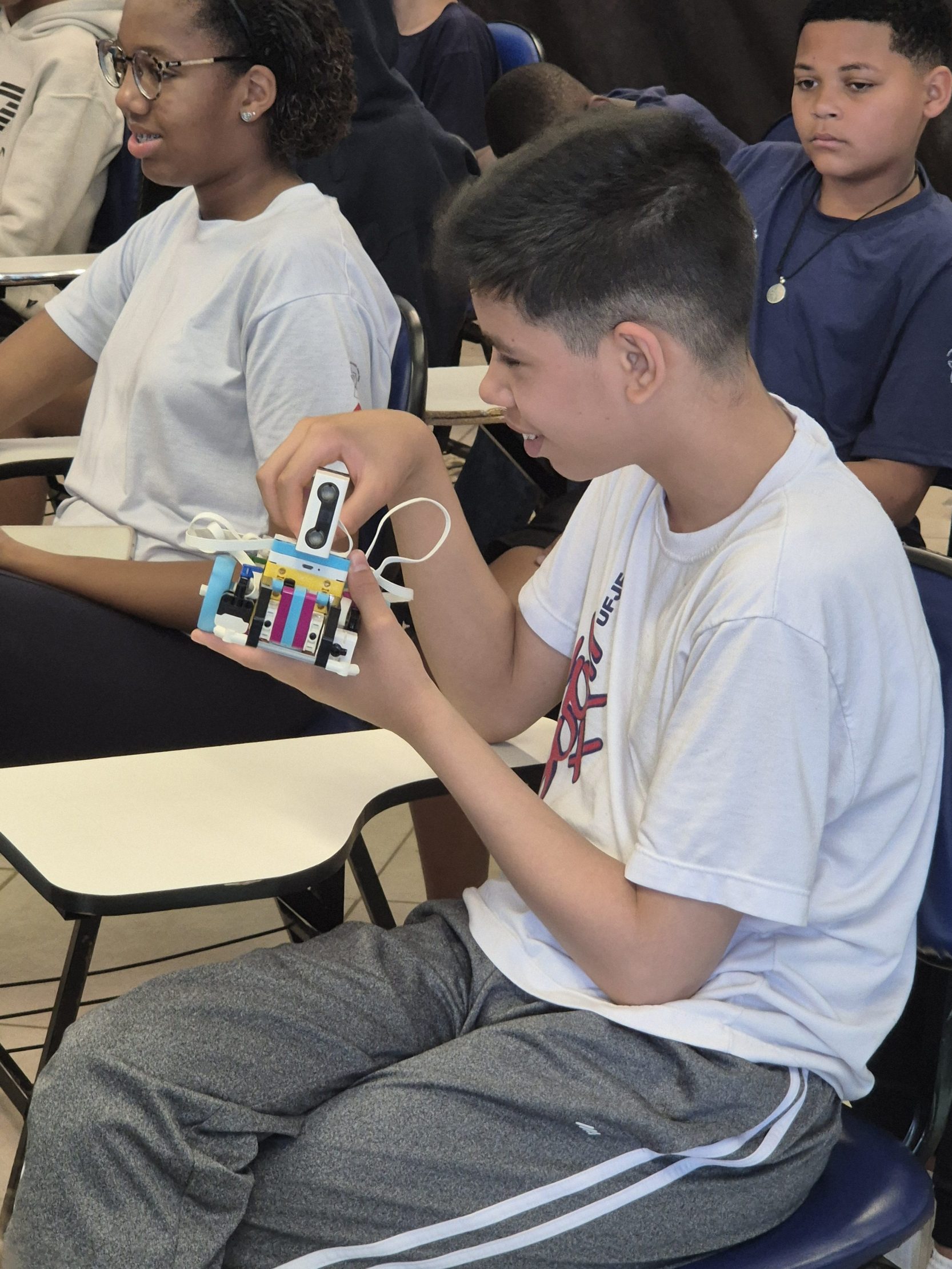 Em seguida, ao projetar uma tela, Marcato ensinou os alunos a controlar “Spike”, o robô que circulava pelas mãos curiosas dos presentes. Logo depois, ele posicionou Spike sobre uma superfície plana e, utilizando a linguagem de programação Python, inseriu comandos que faziam o pequeno robô girar e andar. Alterando números e sinais no código, o pesquisador demonstrou o controle preciso do robô.