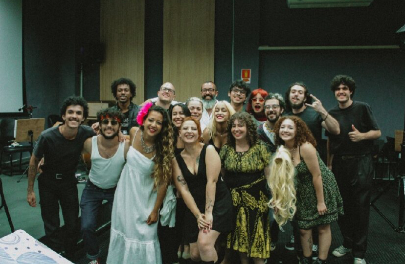 O musical conta com uma equipe ampla de apoio, composta por 12 atores, 6 instrumentistas e 9 profissionais de backstage. Ao centro da foto, vestindo um vestido preto, está a autora da obra, a Madhu (Foto: arquivo pessoal).