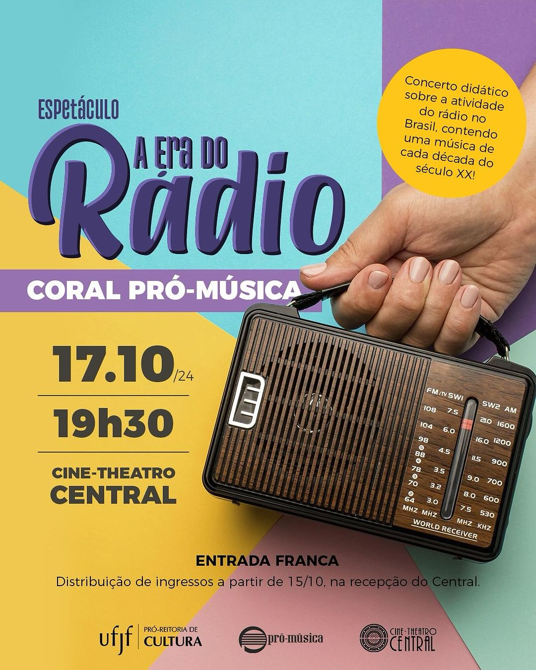 Um encontro com canções que chegaram aos quatro cantos do país por ondas médias e curtas, compostas por nomes como Chiquinha Gonzaga, Pixinguinha e Chico Buarque. Essa é a atração do espetáculo “A Era do Rádio”, que o Coral Pró-Música apresenta nesta quinta-feira, 17, às 19h30, no Cine-Theatro Central. A entrada é franca, por meio de convites a serem distribuídos a partir desta terça, 15, na recepção do teatro, entre 9h e 12h e das 14h às 17h.