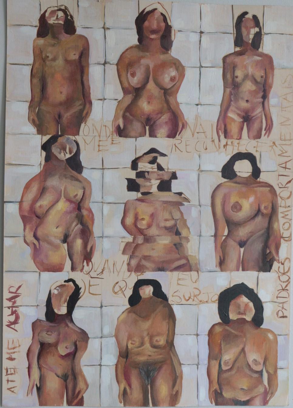 Já no quadro “Padrões Comportamentais”, figuras distorcidas se repetem, com elementos que as diferenciam umas das outras. O mesmo corpo, representado em tinta a óleo sobre papel, adquire novos sentidos e significados a depender da desconfiguração que o envolve. Na tela também estão presentes os escritos “até me achar”, “onde é que eu surjo”, “onde vai me reconhecer” e “padrões comportamentais”, que exprimem, em conjunto com as figuras, a dúvida sobre quando é que surge o “eu” enquanto uma classificação, enquanto um indivíduo, e em especial, enquanto homem ou mulher.