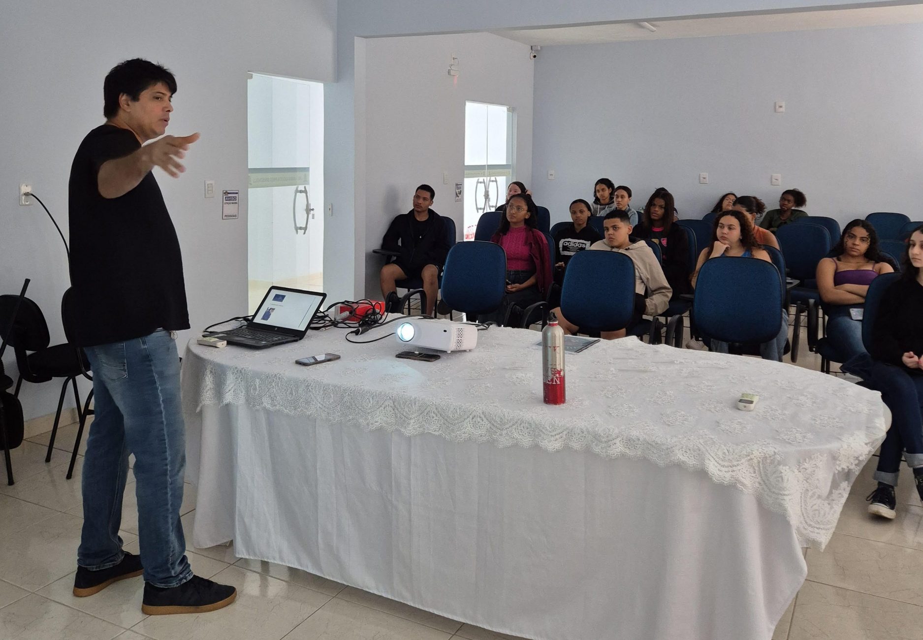 Pesquisador dialoga com alunos sobre finanças e ressalta a importância de gerenciá-las com o mesmo cuidado dedicado à saúde e aos relacionamentos (Foto: Marcella Victer)