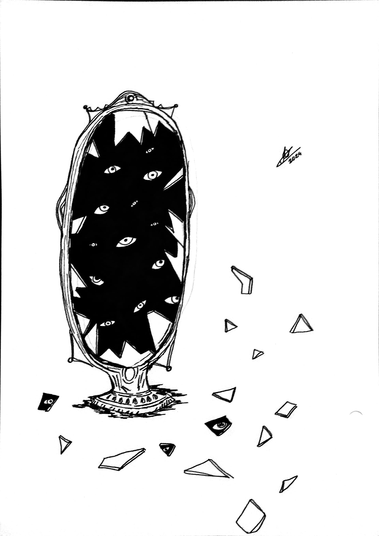 Tal opção estética nasceu a partir do último desenho criado para a exposição. O artista observava as próprias telas, mas sentia falta de algum elemento essencial. “Foi então que surgiu a ideia de incorporar os olhos em todos os cantos, como símbolos de vigilância constante. Esses elementos se uniram em harmonia, dando vida ao conceito final”.