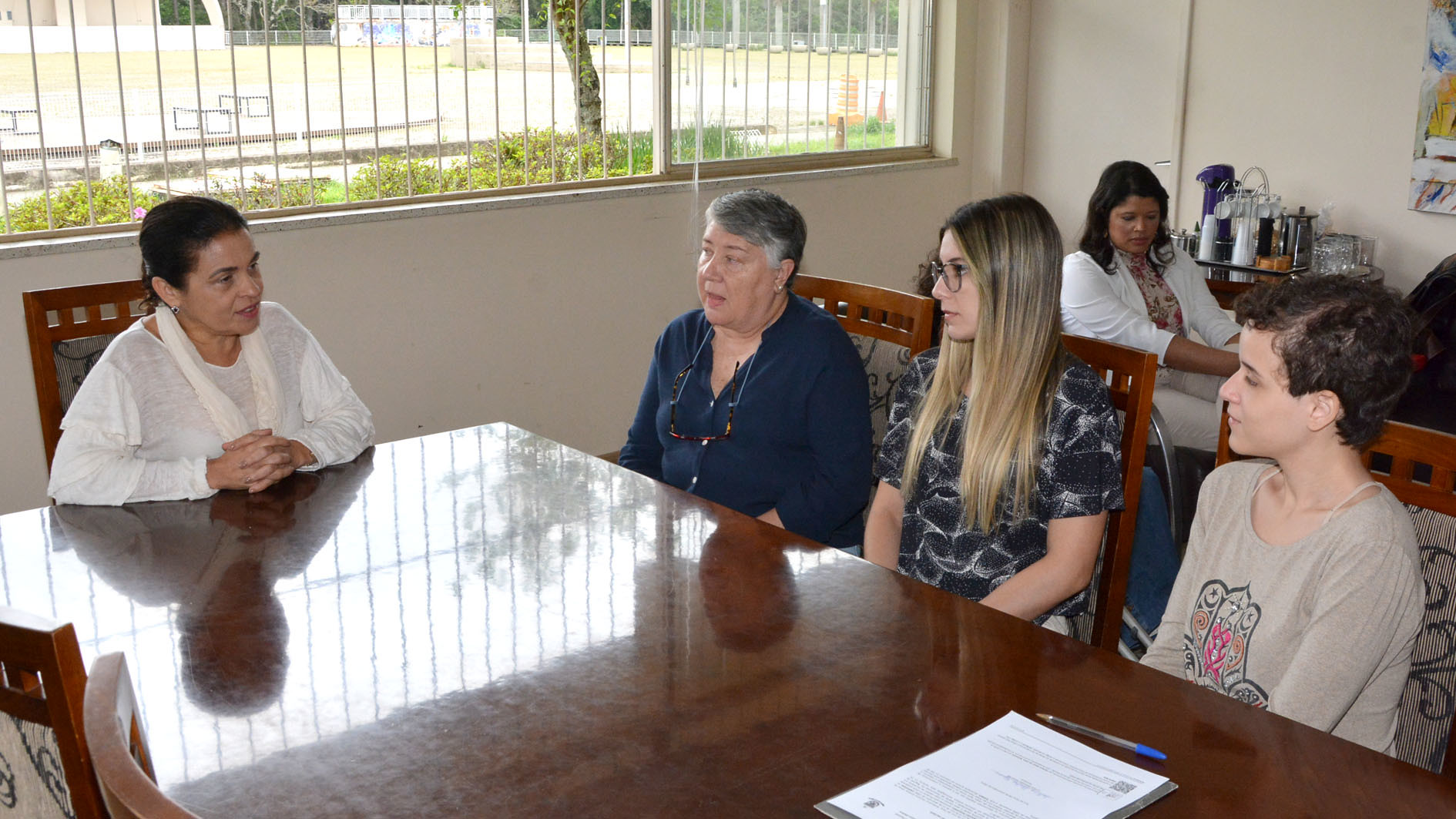 Na mesa, da esquerda para a direita: a reitora da UFJF, Girlene Alves; a diretora de Sustentabilidade e Patrimônio, Rosana Colombara; a gerente de estoques da Diretoria de Sustentabilidade e Patrimônio, Bruna Pereira; e a nova servidora, Letícia Pequeno (Foto: Alexandre Dornelas)