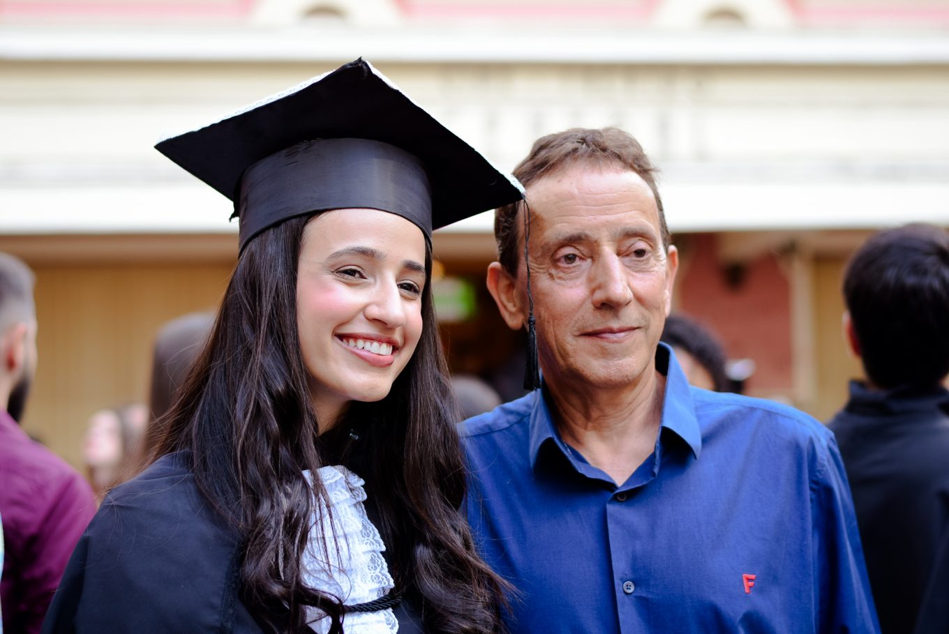 Pai e filha juntos em celebração na formatura. Foto: (Alexandre Dornelas)
