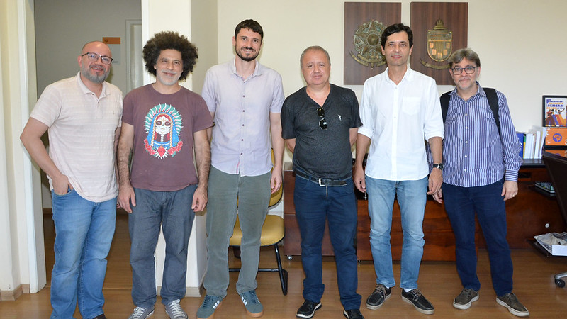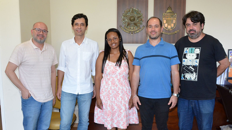 Da esquerda para a direita: o pró-reitor adjunto de Gestão de Pessoas, Warleson Peres; e chefe do departamento de Ciências Humanas do Colégio Aplicação João XXIII, Júlio César de Paula e Silva; o novo servidor Tiago Galinari; o diretor do Colégio Aplicação João XXIII; o vice-reitor, Telmo Ronzanni; e o secretário da Apes, Rubens Luiz Rodrigues (Foto: Alexandre Dornelas)