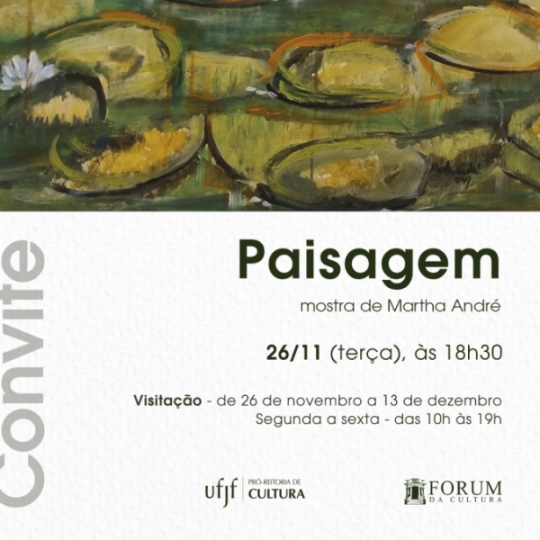 O Forum da Cultura da Universidade Federal da Juiz de Fora (UFJF) chega à última exposição selecionada através do Edital de Ocupação da Galeria de Arte do ano de 2024. As paredes do espaço cultural recebem a mostra “Paisagem”, composta por telas da artista plástica Martha André. O vernissage, gratuito e aberto ao público em geral, ocorre nesta terça-feira, 26, partir das 18h30.