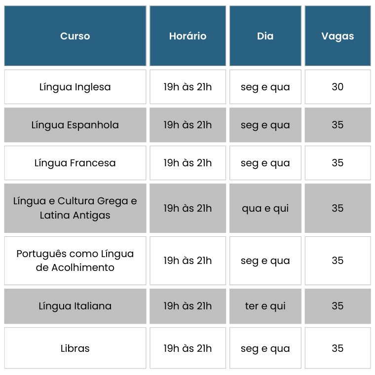 O programa Boa Vizinhança Línguas, da Pró-Reitoria de Extensão (Proex) da Universidade Federal de Juiz de Fora (UFJF), está com inscrições abertas para os cursos presenciais de Inglês, Espanhol, Francês, Português como Língua de Acolhimento, Língua em Cultura Grega e Latina Antigas, Libras e Italiano. Ao todo, são 240 vagas.
