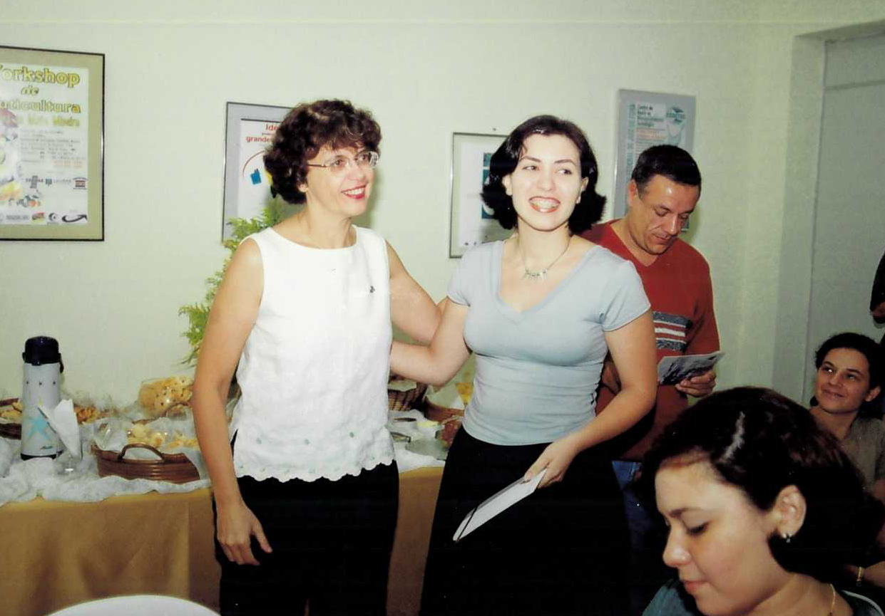 A então reitora da UFJF e atual prefeita de Juiz de Fora, Margarida Salomão (esquerda), em café da manhã com profissionais da imprensa em 2001 (Foto: Alexandre Dornelas/UFJF)