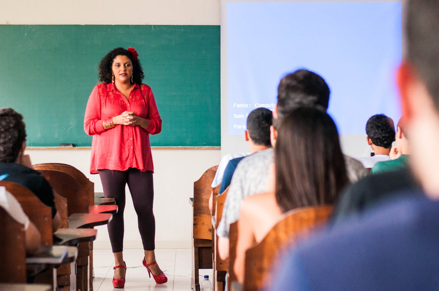A professora do Departamento de Ciências Humanas do Colégio de Aplicação João XXIII e ex-diretora de Ações Afirmativas, Carolina Bezerra, em sala de aula (Foto: Caique Cahon/UFJF)