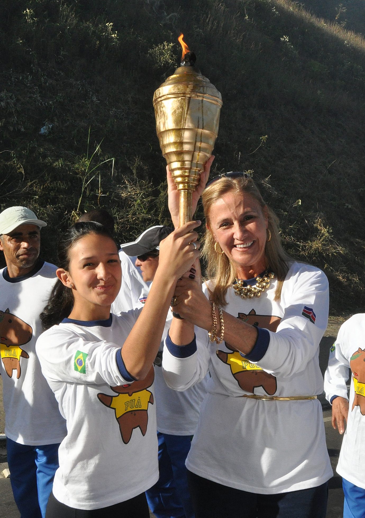 A ex-diretora da Faculdade de Educação Física e Desportos (Faefid), Edna Martin (à direita), com a tocha dos Jogos Pan-Americanos Escolares, disputados em Juiz de Fora, no ano de 2010 (Foto: Alexandre Dornelas/UFJF)