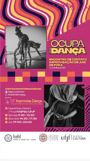 A Faculdade de Educação Física e Desportos (Faefid) da Universidade Federal de Juiz de Fora (UFJF) recebe, entre os dias 21 e 23 de março, o Encontro de Contato e Improvisação. As inscrições são gratuitas e podem ser feitas pelo formulário eletrônico. O evento é promovido pelo Ocupa Dança, movimento do Forum Municipal de Dança da cidade, coletivo composto por dançarinos, professores, pesquisadores e interessados em arte e cultura.