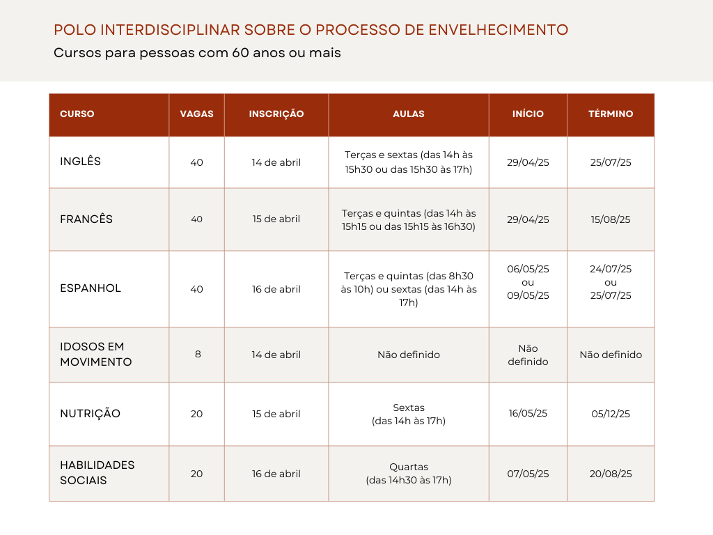 O Polo Interdisciplinar de Ensino, Pesquisa e Extensão sobre o Processo de Envelhecimento abre inscrições para pessoas de 60 anos ou mais em seis cursos gratuitos. As atividades são presenciais e acontecem na Casa Helenira Rezende (Casa de Cultura).