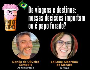O que influencia nossas escolhas de destinos de viagens? Existe espaço para o turismo sustentável na realidade atual? “O objetivo deste debate é trazer reflexões, dados e questões relacionadas ao grande fluxo de movimentação de pessoas por todo canto do mundo, que possuem diferentes interesses e desejos de conhecer lugares de naturezas e culturas, e os seus efeitos e impactos em contextos rural e urbano”, explica Edilaine Albertino de Moraes, coordenadora do Grupo de Pesquisa e Extensão TBC-Rede: Turismo de base comunitária, Sustentabilidade e Redes. Dividindo o palco com Edilaine, Danilo de Oliveira Sampaio, pesquisador no Departamento de Ciências Administrativas (CAD), adianta que as questões referentes ao desenvolvimento sustentável são tratadas de forma “superficial, errônea e descompromissada” por líderes políticos e gestores de empresas da esfera privada. “Temos que interagir com a comunidade, nos mais diferentes ambientes, tornar a ciência disponível à população. A troca entre os experimentos necessariamente passa pelo contato com a sociedade. Assim a evolução acontece!”, destaca.