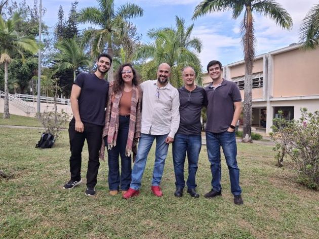 Cristiano Rodrigues, diretor de Imagem Institucional e coordenador do projeto Rádio e TV (ao centro), ao lado do técnico do Laboratório de Telecomunicações da UFJF, Rogério Casagrande, e dos bolsistas Thiago Baesso, Taís Alves e Gabriel Vinhosa (Foto: Kaio Lara/UFJF)