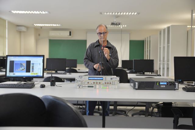 Técnico Rogério Casagrande conduz testes de aparelhos adquiridos para a emissora (Foto: Twin Alvarenga/UFJF)
