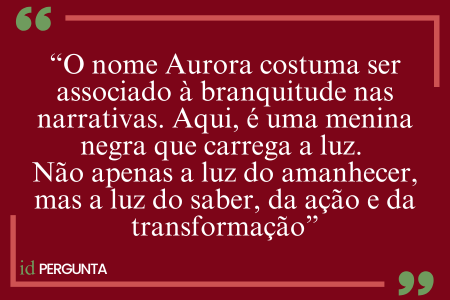Apesar de carregar uma linhagem real e dons extraordinários, Aurora é retratada como uma menina comum, com inseguranças, frustrações, desejos e sonhos. Seu nome já é um símbolo: “Aurora” costuma ser associado à branquitude nas narrativas. Aqui, é uma menina negra que carrega a luz. Não apenas a luz do amanhecer, mas a luz do saber, da ação e da transformação.