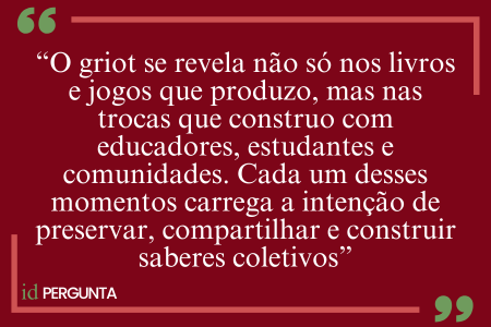 O griot se revela não só nos livros e jogos que produzo, mas também nas trocas que construo com educadores, estudantes e comunidades. Sou griot quando conto histórias em escolas, quando atuo junto aos projetos políticos pedagógicos, quando desenvolvo ações de EAN ou quando publico vídeos nas redes sociais da “Raiou, Griot”. Cada um desses momentos carrega a intenção de preservar, compartilhar e construir saberes coletivos.