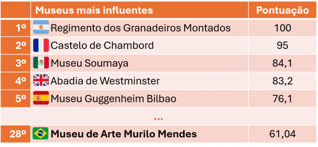Para tornar a classificação mais justa, optou-se por utilizar uma metodologia específica: “os museus foram inicialmente classificados com base em seu engajamento digital total. Esses números brutos foram então convertidos para uma escala logarítmica, permitindo comparações justas entre instituições de tamanhos e públicos muito distintos. O resultado é uma medida refinada de influência, que reflete tanto o alcance quanto a capacidade de promover interações significativas no ambiente on-line”, explica o texto divulgado pela organização do evento.