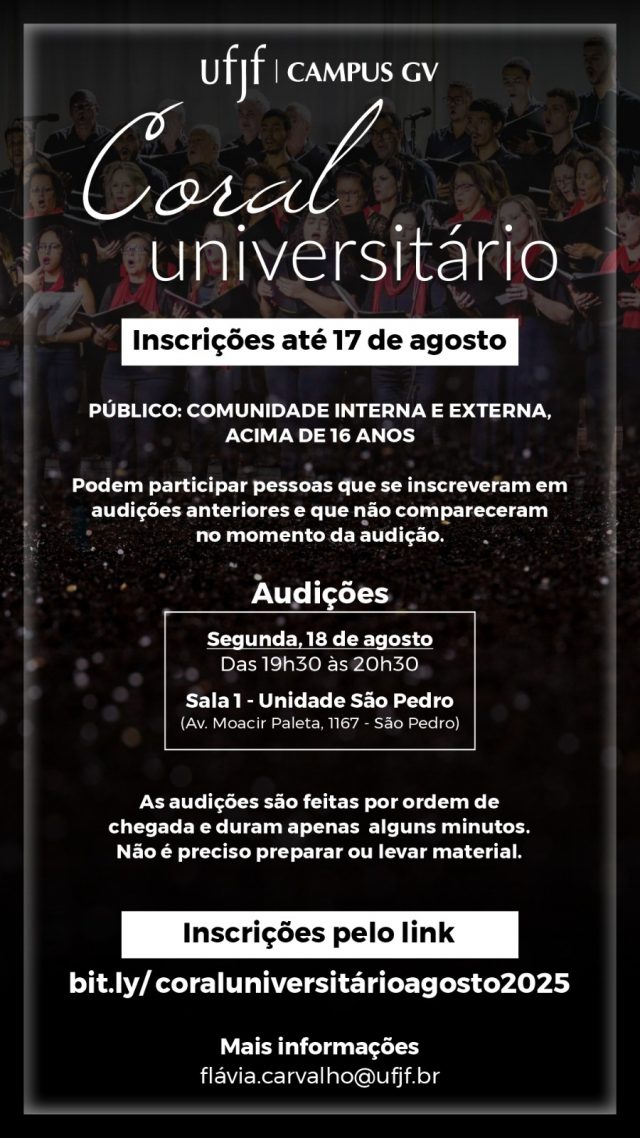 Estão abertas as inscrições para uma nova etapa de audição do Coral do Campus Governador Valadares da Universidade Federal de Juiz de Fora (UFJF-GV). O grupo, que atualmente conta com 25 coralistas, busca ampliar as oportunidades para membros da comunidade acadêmica e público externo. As inscrições podem ser realizadas até o dia 17 de agosto, neste link.