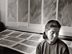 Fayga Ostrower em seu ateliê com provas do Político do Itamaraty, 1969 (Foto – Instituto Fayga Ostrower)