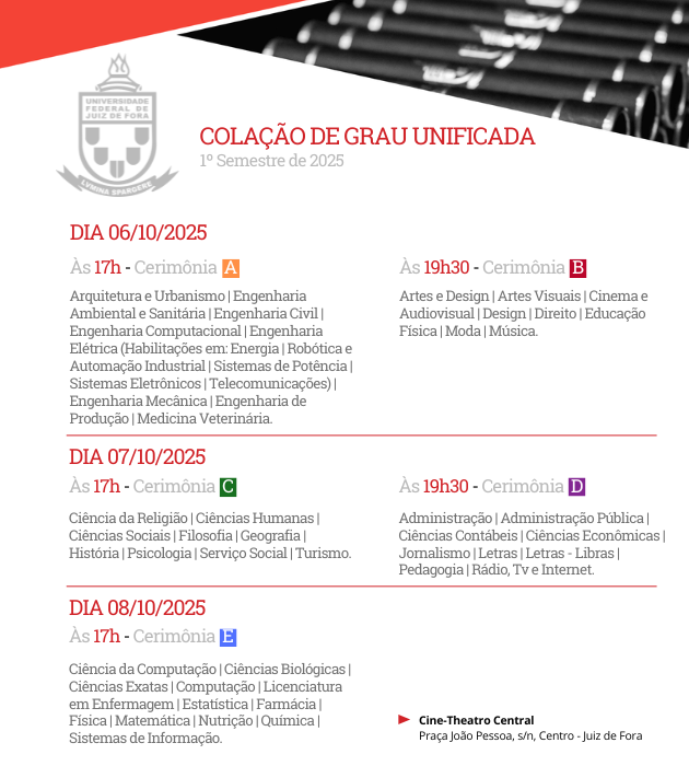 A Universidade Federal de Juiz de Fora (UFJF) realiza, nos dias 6, 7 e 8 de outubro, a Colação de Grau Unificada, reunindo mais de 1.100 formandos no palco histórico do Cine-Theatro Central. As cerimônias celebram a conclusão da trajetória acadêmica dos estudantes e ocorrem nos seguintes horários: no dia 6 de outubro, em duas sessões, sendo a primeira realizada às 17h e a segunda às 19h30. No dia 7 de outubro, também serão realizadas duas colações, nos mesmos horários. Já no dia 8 de outubro, acontece a última cerimônia, marcada para às 17h.