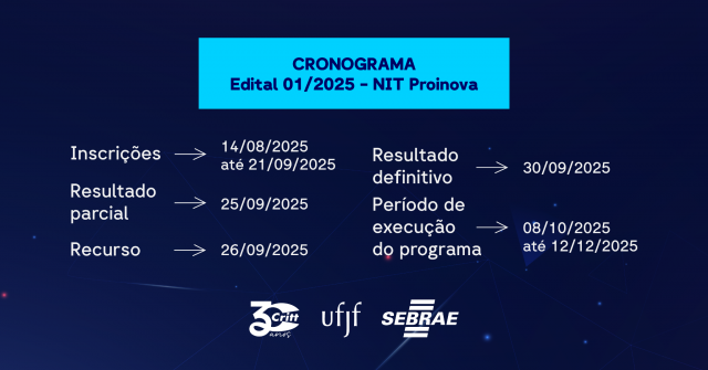 A Pró-Reitoria de Inovação (Proinova) da Universidade Federal de Juiz de Fora (UFJF) prorrogou as inscrições do edital do Núcleo de Inovação Tecnológica (NIT Proinova) para o dia 21 de setembro. O projeto busca selecionar professores em parceria com EPPs – Empresas de Pequeno Porte (startups, deep techs e spin-offs) para a execução do programa Sebrae.