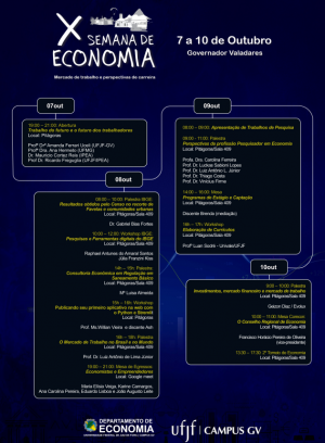 O campus Governador Valadares da Universidade Federal de Juiz de Fora (UFJF-GV) convida estudantes, profissionais e a comunidade em geral para participar da X Semana de Economia (SEMECO 2025). Com o tema “O Mercado de Trabalho e Perspectivas de Carreira”, o evento ocorrerá entre os dias 07 e 10 de outubro, nas instalações da unidade Centro.