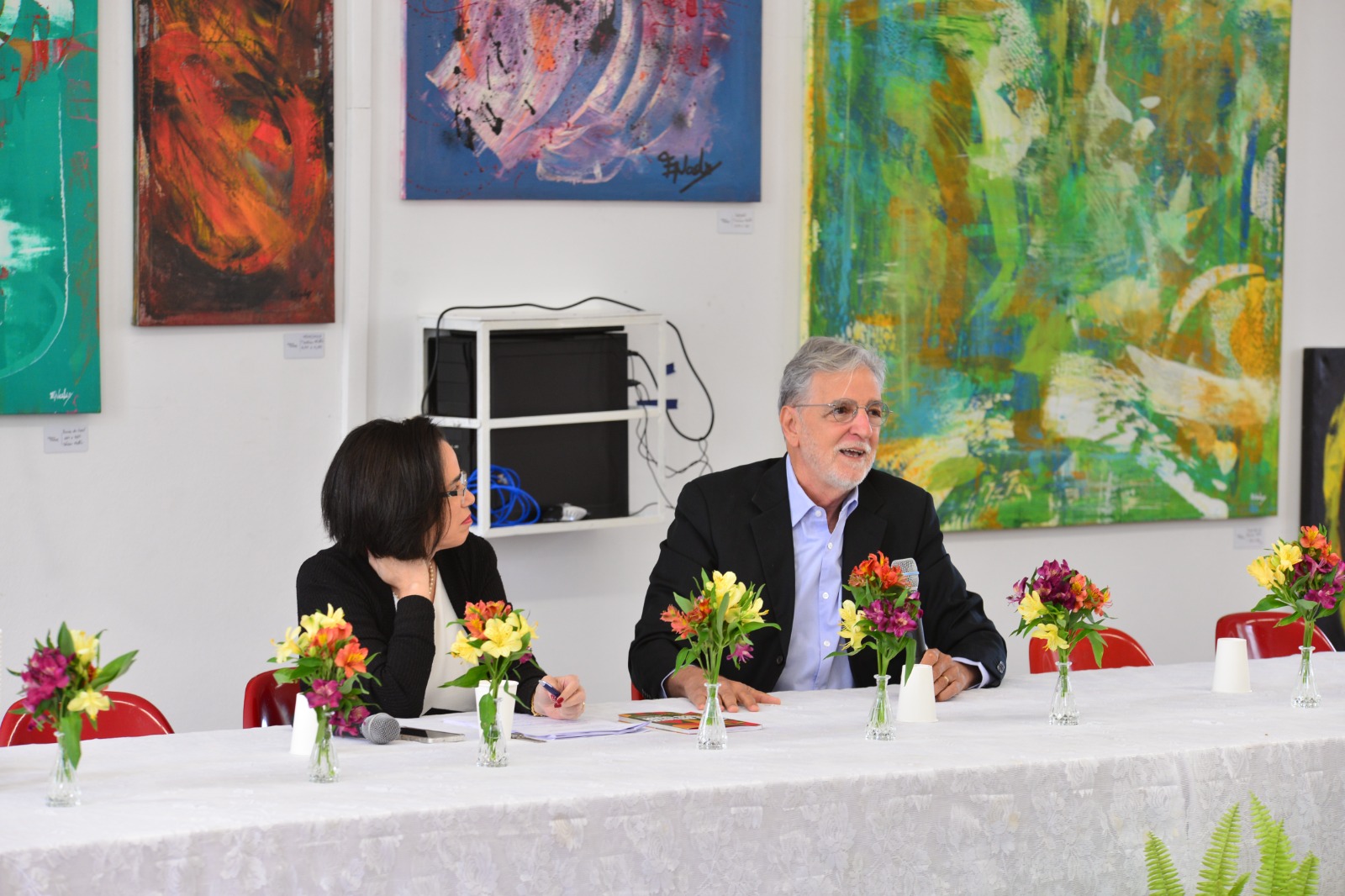 O professor aposentado de Sociologia da UFMG, João Batista dos Mares Guia, participa da abertura da Semana do Direito, ao lado da professora Cláudia Maria Toledo (Foto: Twin Alvarenga/UFJF)