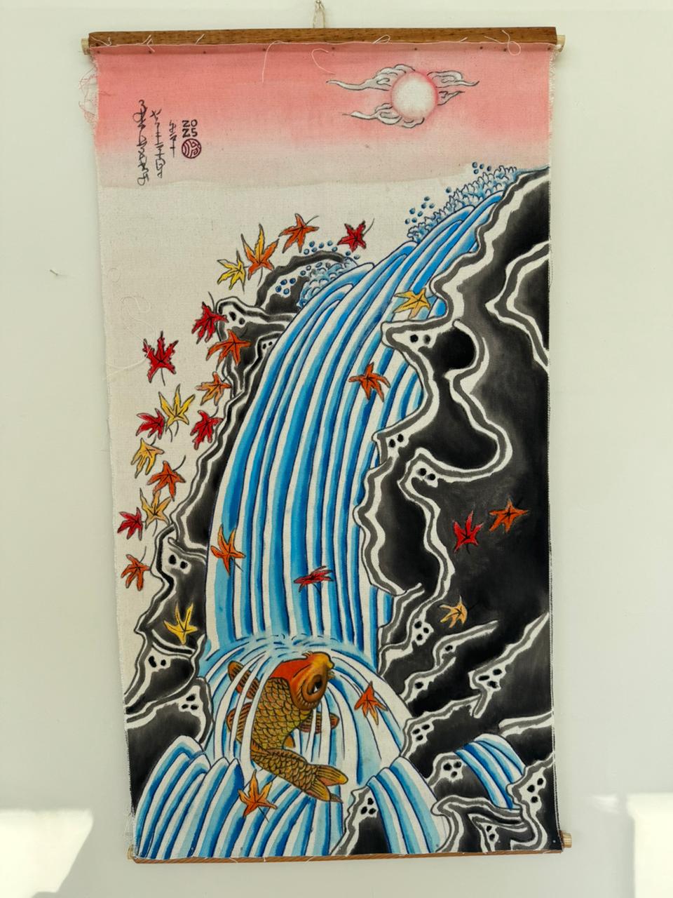 Entre os destaques da mostra está a obra “Peixe e Cachoeira”, que representa a tradicional história das carpas que, ao superarem seus limites ao subirem o rio para procriar, transformam-se em belos dragões