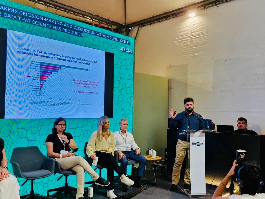 Laís Coura Soranço está no último ano do doutorado e faz parte do grupo de pesquisa do professor há aproximadamente seis anos. Grande parte das atividades que desenvolve no LEA integra os estudos apresentados por ele na COP-30, especialmente aqueles relacionados ao impacto climático da aquicultura.