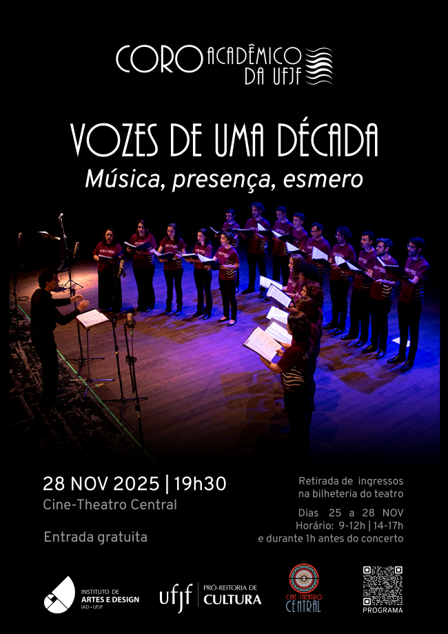 O Coro Acadêmico da Universidade Federal de Juiz de Fora (UFJF) realiza, nesta sexta-feira, 28, o concerto “Vozes de uma Década: Música, Presença, Esmero”, em comemoração dos 10 anos de atividade. O evento acontece no Cine-Theatro Central, às 19h30.