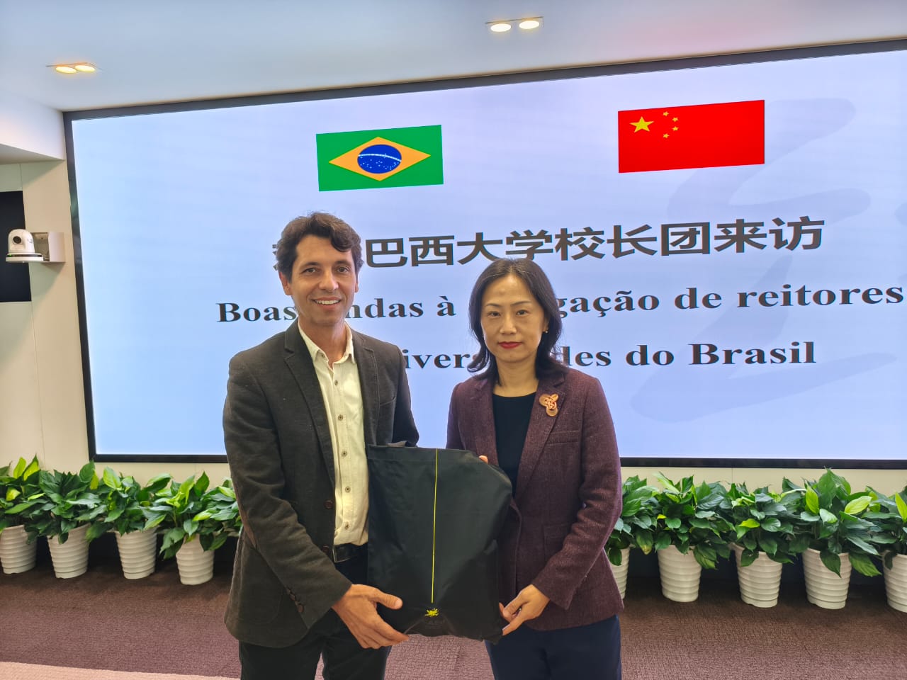 Cadilhe se reuniu com as professoras Yu Jing, Zhang Fangfang e com o professor Lauro Meller, discutindo políticas linguísticas, formação interdisciplinar e possibilidades de cooperação acadêmica entre a BFSU e a UFJF. Ao final do encontro, recebeu como cortesia um lenço com inscrições nas diversas línguas ensinadas pela instituição.